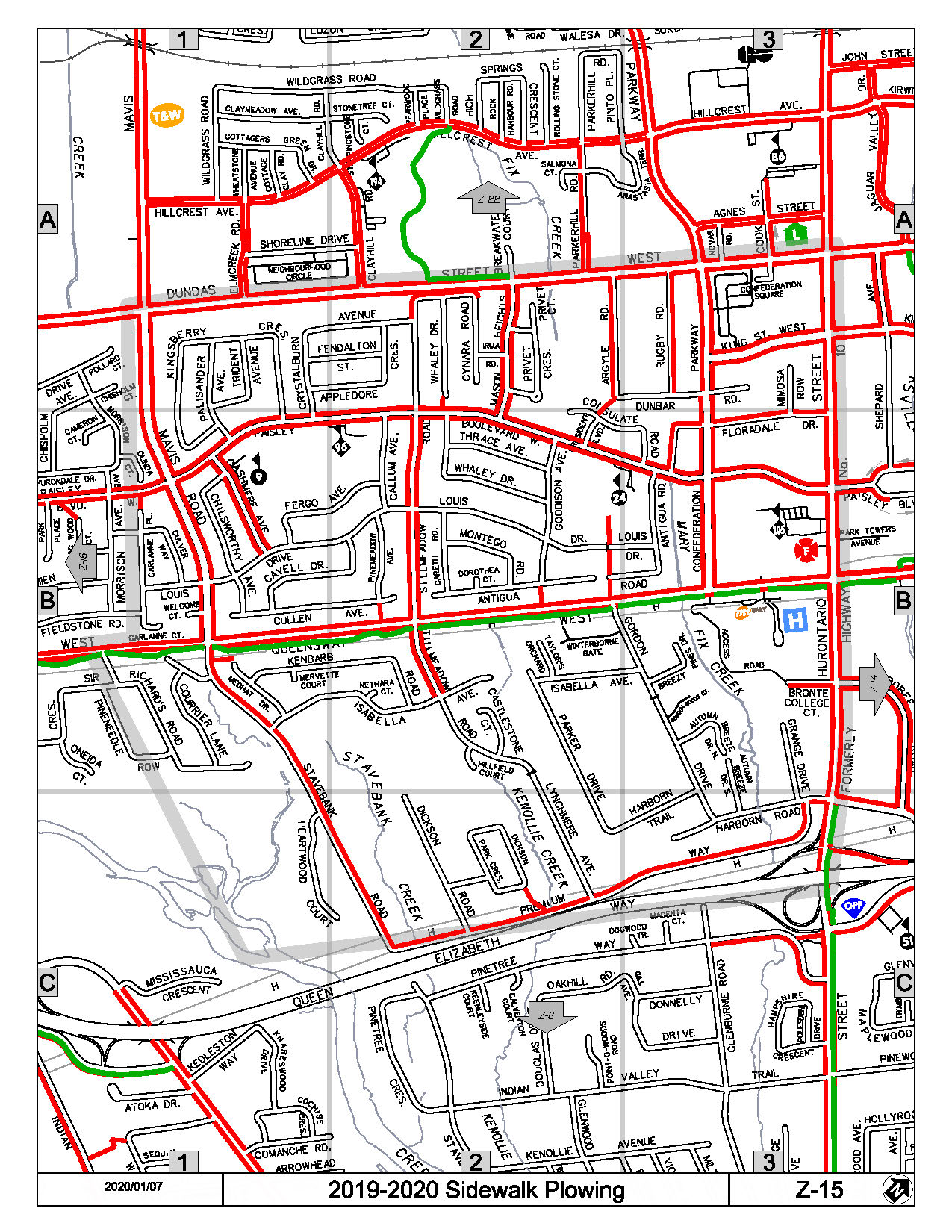 Priority sidewalks are marked with red lines ,multi-use trails with green lines, on the map below to indicate which areas will be plowed by the City of Mississauga when snowfalls exceed 8cm (3 inches). A priority sidewalk or priority multi-use trail is defined as being located on a major road or bus route or accessing hospitals, schools and nursing homes. We are counting on you to: Clear snow and ice from sidewalks as soon as possible after a snowfall to ensure that they are safe for all residents Help others, especially seniors and disabled persons to clear their driveways and sidewalks. .