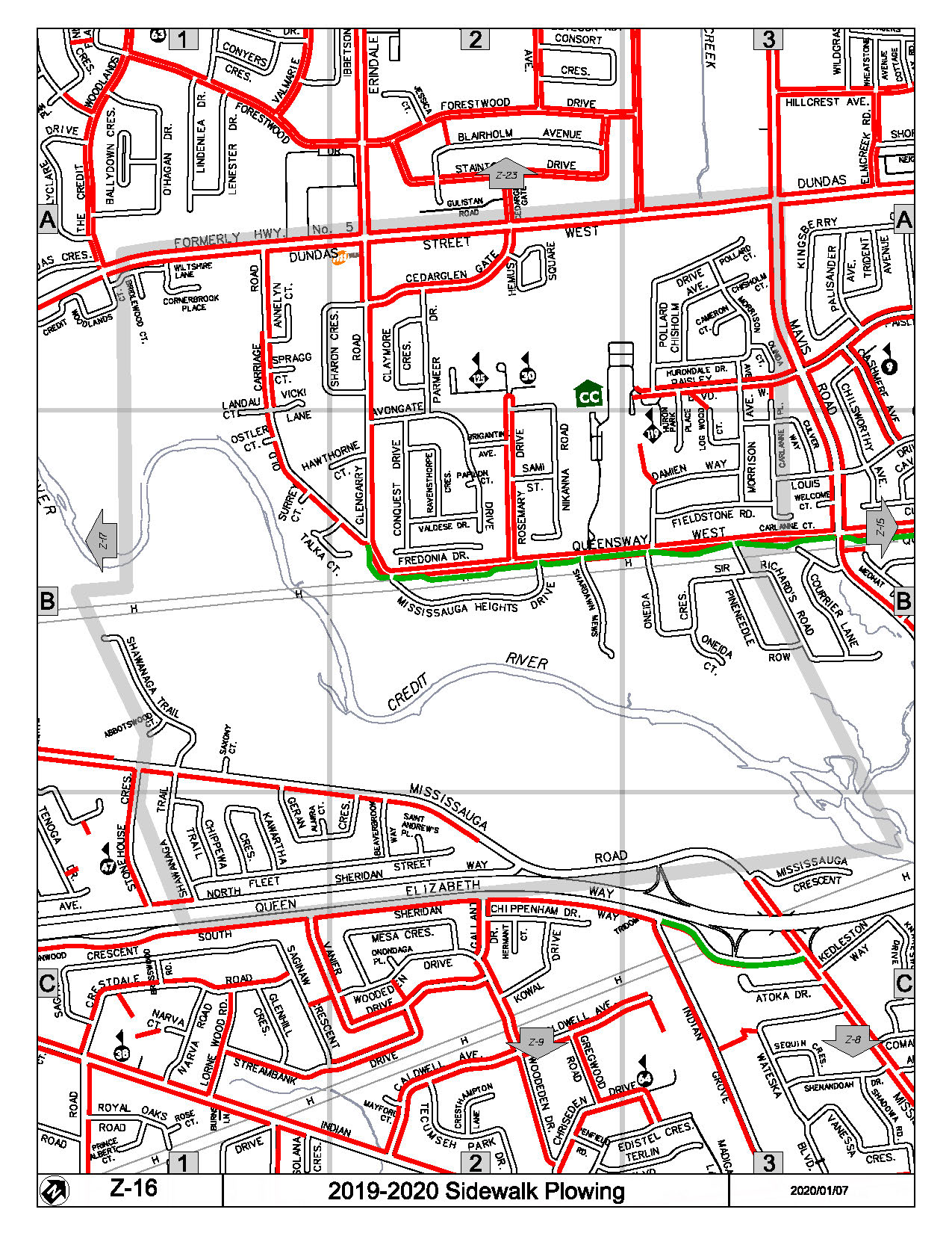 Priority sidewalks are marked with red lines ,multi-use trails with green lines, on the map below to indicate which areas will be plowed by the City of Mississauga when snowfalls exceed 8cm (3 inches). A priority sidewalk or priority multi-use trail is defined as being located on a major road or bus route or accessing hospitals, schools and nursing homes. We are counting on you to: Clear snow and ice from sidewalks as soon as possible after a snowfall to ensure that they are safe for all residents Help others, especially seniors and disabled persons to clear their driveways and sidewalks. .