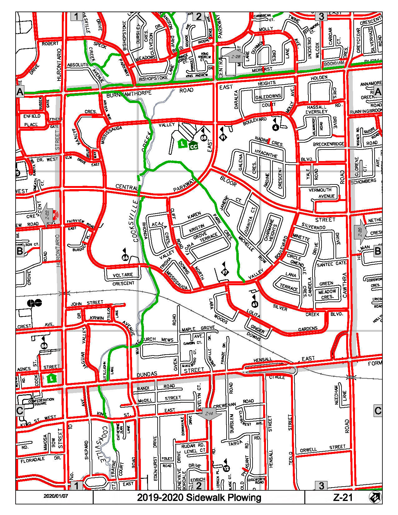 Priority sidewalks are marked with red lines ,multi-use trails with green lines, on the map below to indicate which areas will be plowed by the City of Mississauga when snowfalls exceed 8cm (3 inches). A priority sidewalk or priority multi-use trail is defined as being located on a major road or bus route or accessing hospitals, schools and nursing homes. We are counting on you to: Clear snow and ice from sidewalks as soon as possible after a snowfall to ensure that they are safe for all residents Help others, especially seniors and disabled persons to clear their driveways and sidewalks. .