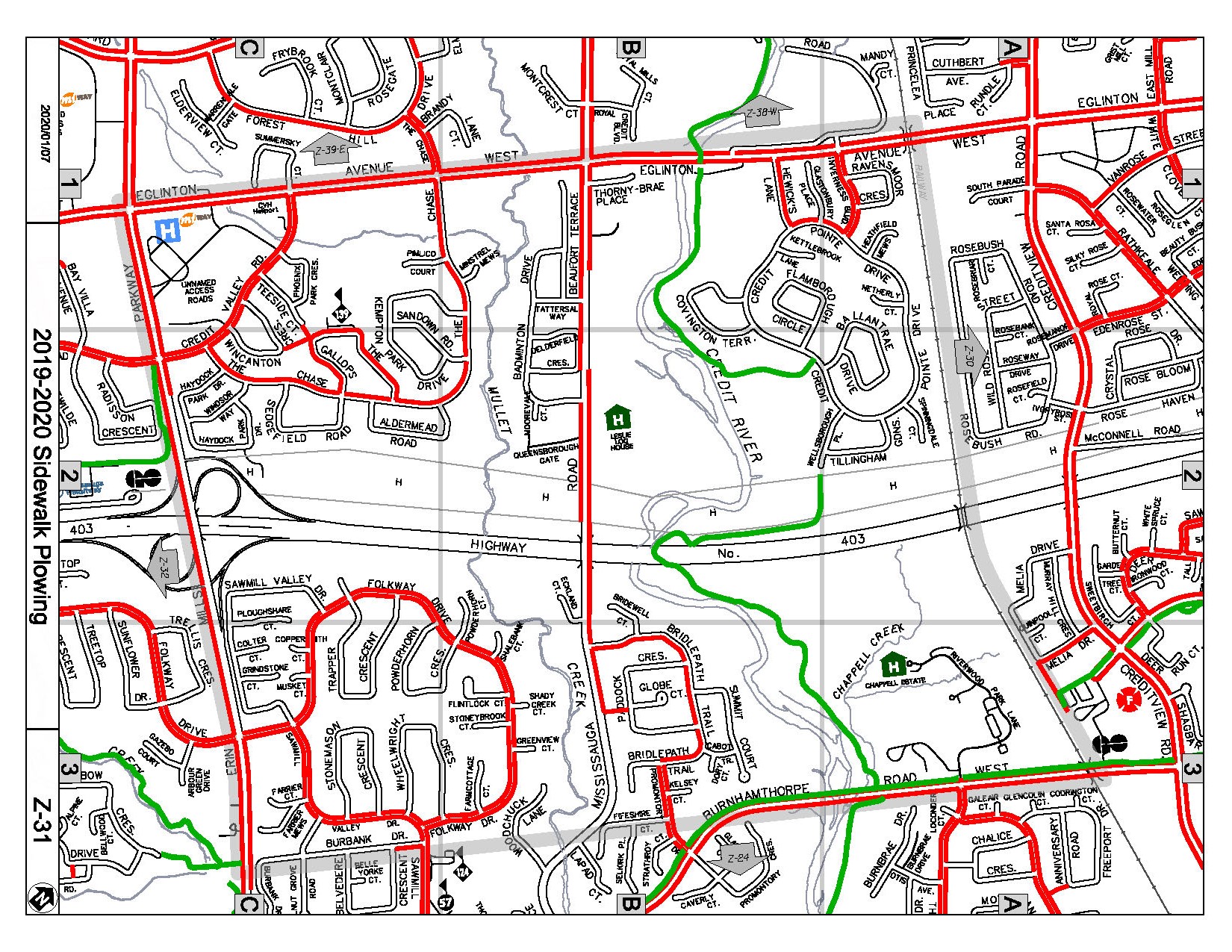 Priority sidewalks are marked with red lines ,multi-use trails with green lines, on the map below to indicate which areas will be plowed by the City of Mississauga when snowfalls exceed 8cm (3 inches). A priority sidewalk or priority multi-use trail is defined as being located on a major road or bus route or accessing hospitals, schools and nursing homes. We are counting on you to: Clear snow and ice from sidewalks as soon as possible after a snowfall to ensure that they are safe for all residents Help others, especially seniors and disabled persons to clear their driveways and sidewalks. .