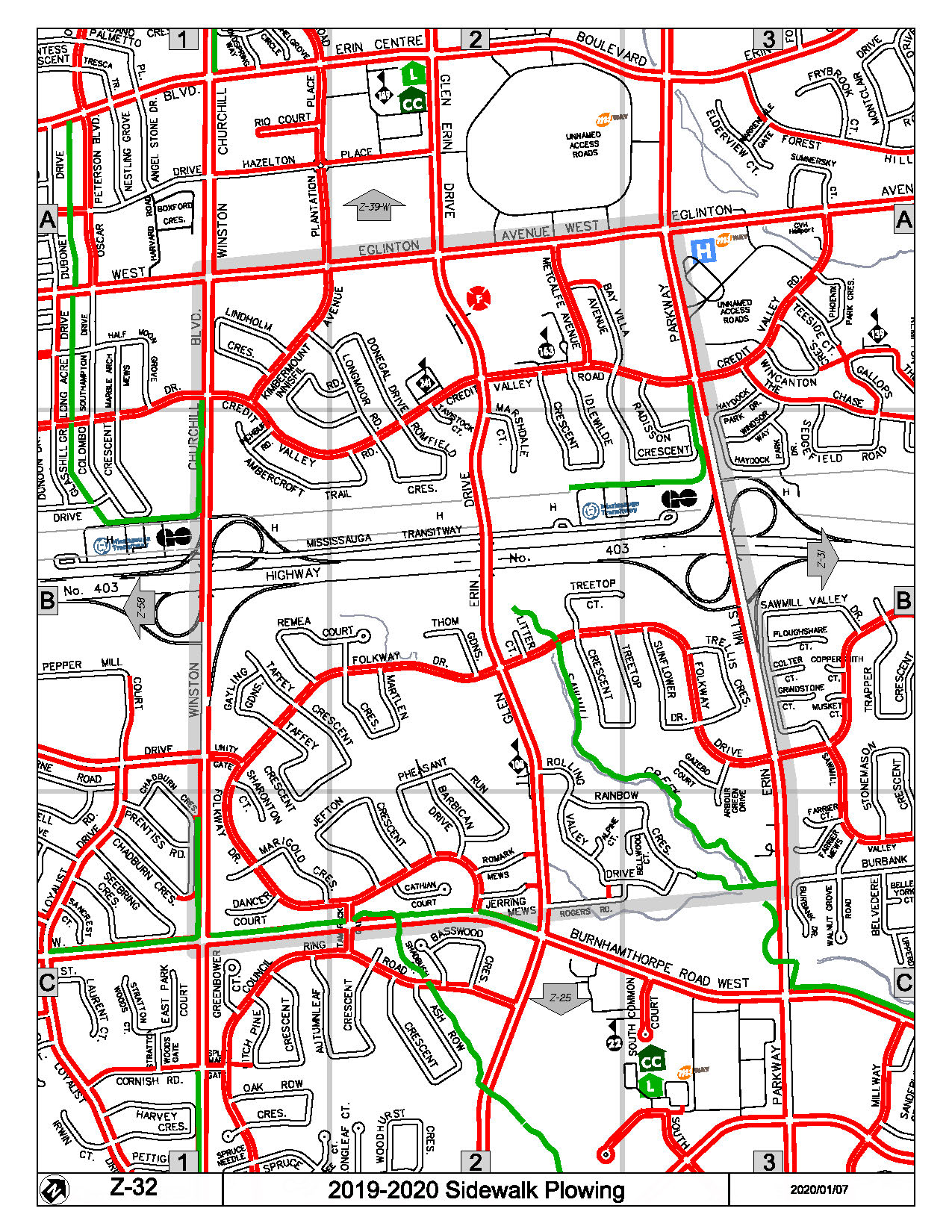 Priority sidewalks are marked with red lines ,multi-use trails with green lines, on the map below to indicate which areas will be plowed by the City of Mississauga when snowfalls exceed 8cm (3 inches). A priority sidewalk or priority multi-use trail is defined as being located on a major road or bus route or accessing hospitals, schools and nursing homes. We are counting on you to: Clear snow and ice from sidewalks as soon as possible after a snowfall to ensure that they are safe for all residents Help others, especially seniors and disabled persons to clear their driveways and sidewalks. .