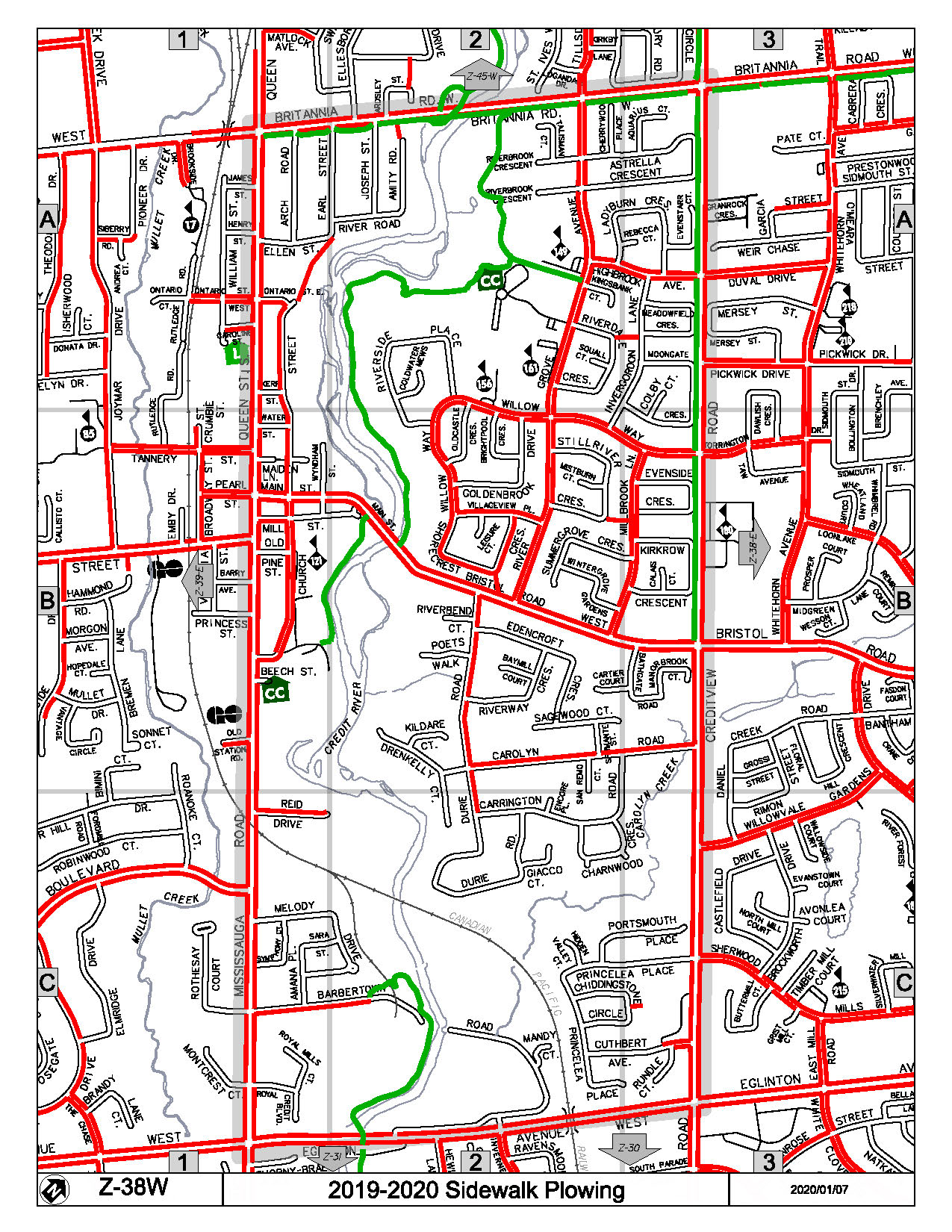 Priority sidewalks are marked with red lines ,multi-use trails with green lines, on the map below to indicate which areas will be plowed by the City of Mississauga when snowfalls exceed 8cm (3 inches). A priority sidewalk or priority multi-use trail is defined as being located on a major road or bus route or accessing hospitals, schools and nursing homes. We are counting on you to: Clear snow and ice from sidewalks as soon as possible after a snowfall to ensure that they are safe for all residents Help others, especially seniors and disabled persons to clear their driveways and sidewalks. .