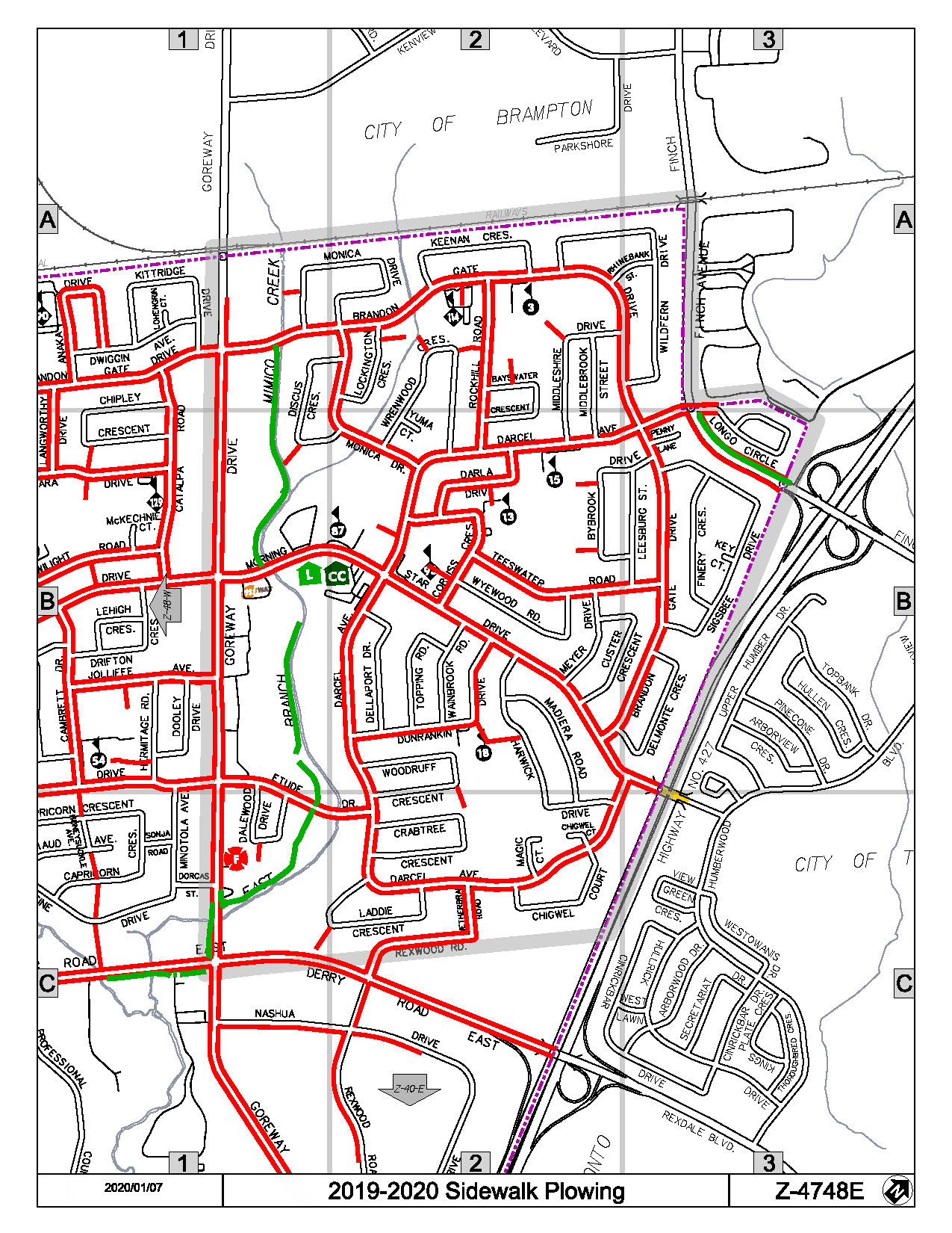 Priority sidewalks are marked with red lines ,multi-use trails with green lines, on the map below to indicate which areas will be plowed by the City of Mississauga when snowfalls exceed 8cm (3 inches). A priority sidewalk or priority multi-use trail is defined as being located on a major road or bus route or accessing hospitals, schools and nursing homes. We are counting on you to: Clear snow and ice from sidewalks as soon as possible after a snowfall to ensure that they are safe for all residents Help others, especially seniors and disabled persons to clear their driveways and sidewalks. .