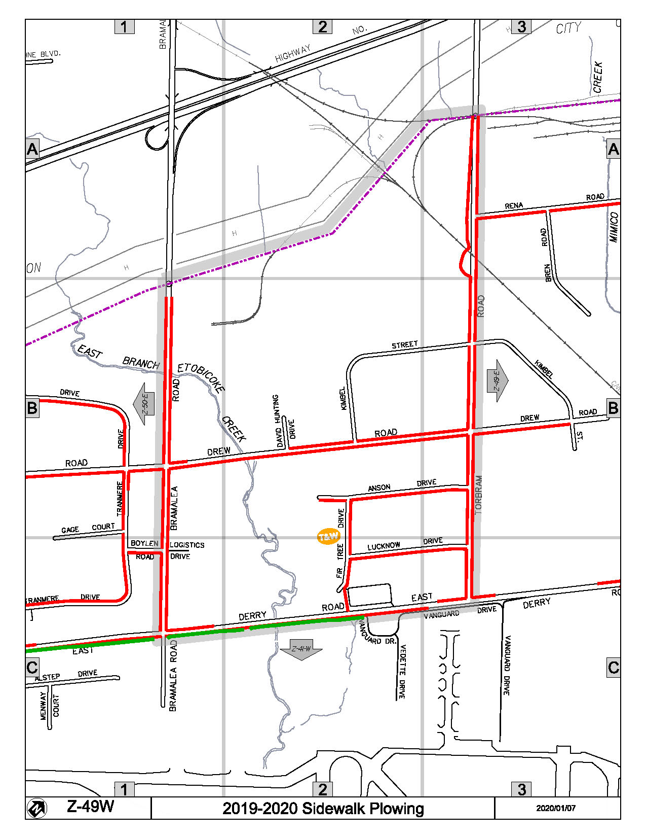 Priority sidewalks are marked with red lines ,multi-use trails with green lines, on the map below to indicate which areas will be plowed by the City of Mississauga when snowfalls exceed 8cm (3 inches). A priority sidewalk or priority multi-use trail is defined as being located on a major road or bus route or accessing hospitals, schools and nursing homes. We are counting on you to: Clear snow and ice from sidewalks as soon as possible after a snowfall to ensure that they are safe for all residents Help others, especially seniors and disabled persons to clear their driveways and sidewalks. .