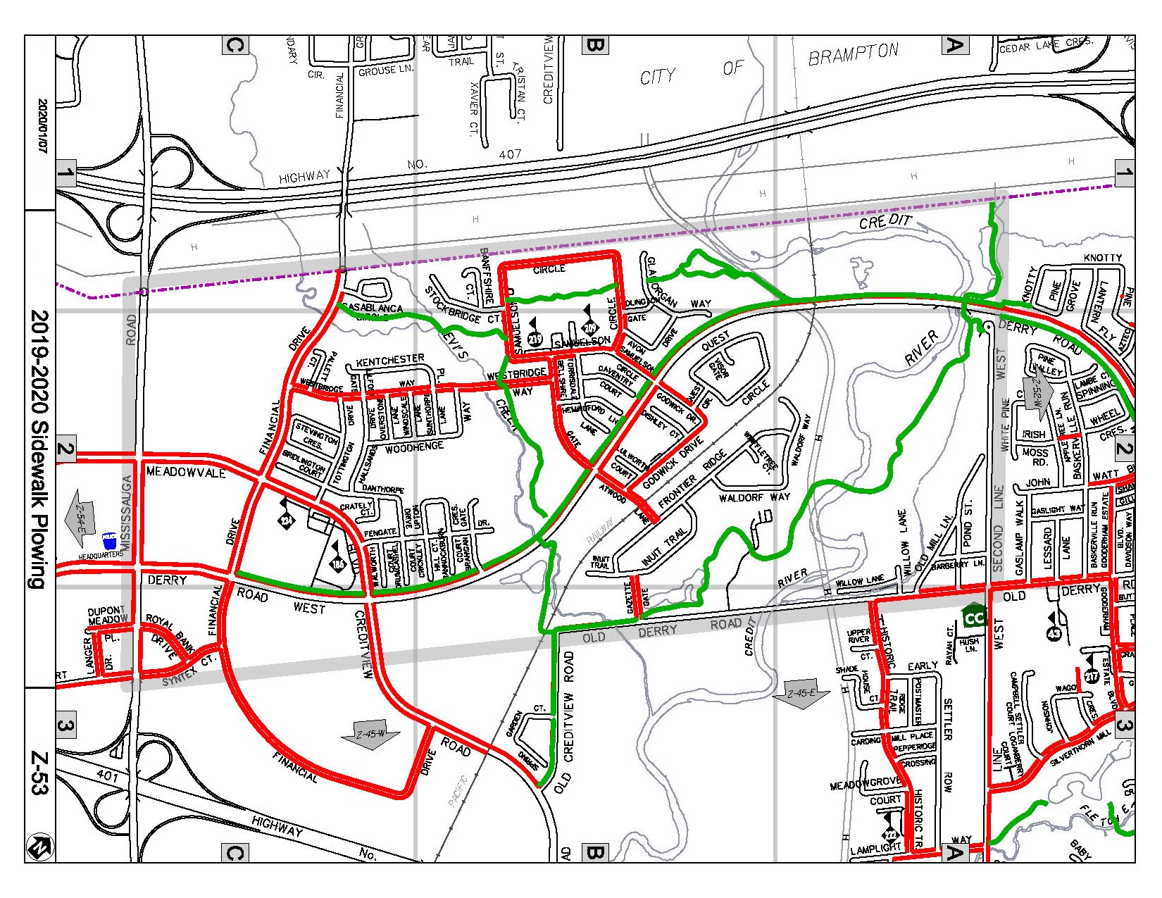 Priority sidewalks are marked with red lines ,multi-use trails with green lines, on the map below to indicate which areas will be plowed by the City of Mississauga when snowfalls exceed 8cm (3 inches). A priority sidewalk or priority multi-use trail is defined as being located on a major road or bus route or accessing hospitals, schools and nursing homes. We are counting on you to: Clear snow and ice from sidewalks as soon as possible after a snowfall to ensure that they are safe for all residents Help others, especially seniors and disabled persons to clear their driveways and sidewalks. .